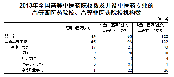2013年全国高等中医药院校数及开设中医药专业的 高等西医药院校、高等非医药院校机构数