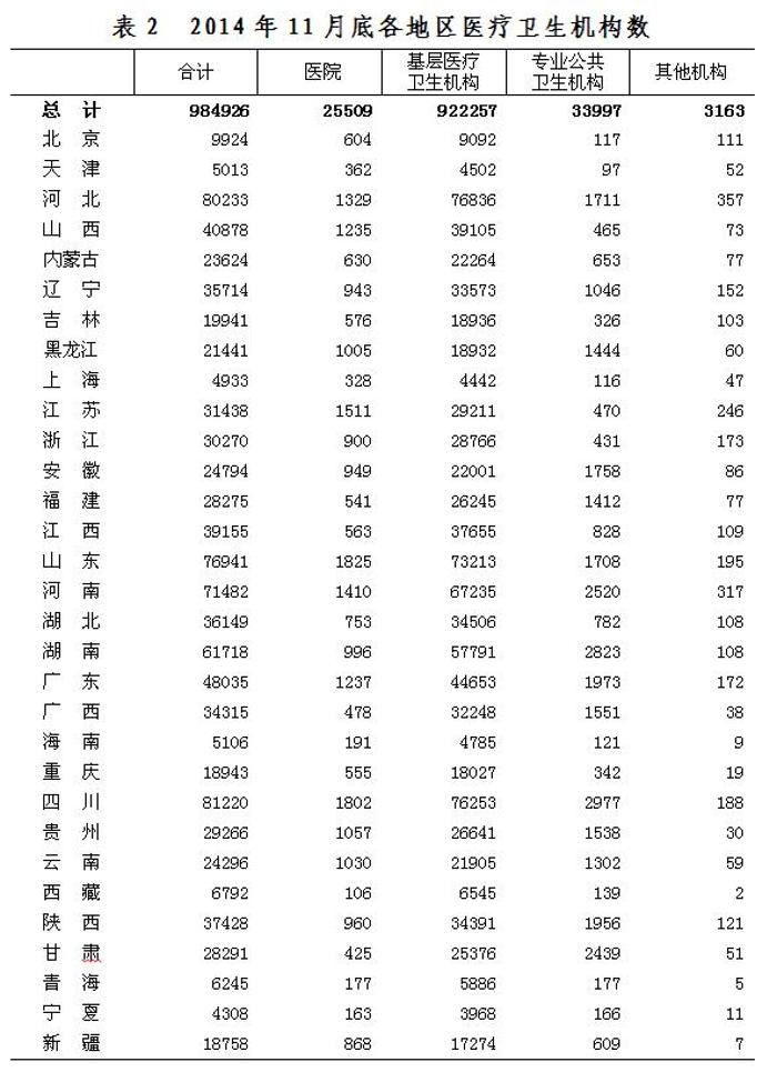 截至2014年11月底,全国医疗卫生机构数达98.5万个,其中:医院2.6万个,基层医疗卫生机构92.2万个,专业公共卫生机构3.4万个,其他机构0.3万个。与2013年11月底比较,全国医疗卫生机构增加22968个,其中:医院增加1039个,基层医疗卫生机构减少373,专业公共卫生机构增加21541个。