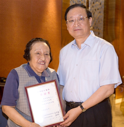图为王国强(右一)为柴嵩岩颁发荣誉证书。