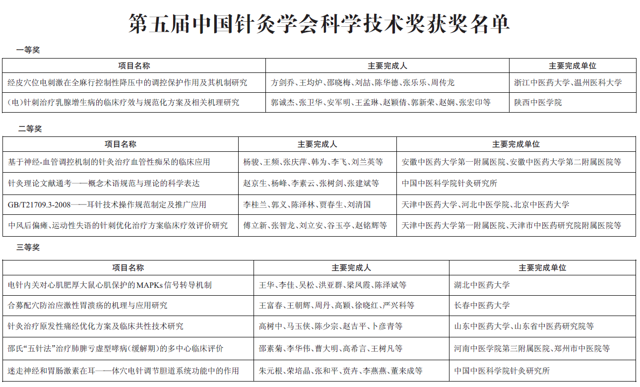 开幕式还宣布了第五届中国针灸学会科学技术奖11个获奖项目。