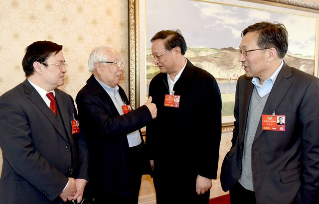3月8日,97岁的全国政协委员、国医大师李辅仁(左二)和国家卫生计生委副主任、国家中医药管理局局长王国强委员(右二)、史大卓委员(右一)、温建民委员(左一)在医卫界联组会后亲切交谈。李辅仁称赞近年来中医药事业的快速发展。 中国中医药报记者 巨锋/摄