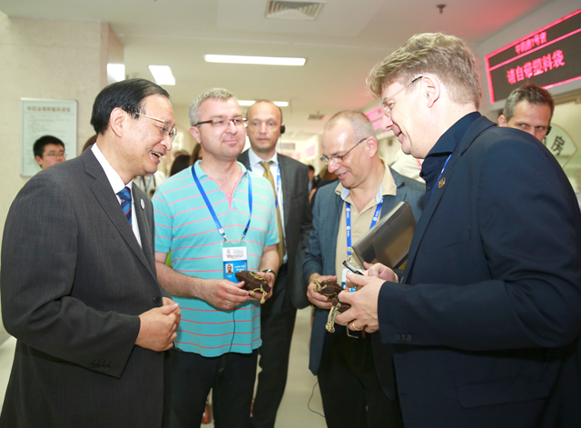 6月19日,参加第二届中国中东欧国家卫生部长论坛的外宾们在国家中医药管理局局长王国强(左一)的陪同下,到江苏省苏州市中医院参观访问,了解该院特色中医药服务及医院发展情况。