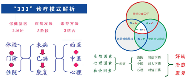 “333”诊疗模式用中医+西医+心理3种疗法的有机结合,针对保健就医3场所的人群所处的疾病发展3阶段的状态制定出符合个体的诊疗保健方案,在就医保健全程充分应用中医的辨证论治、西医的辨病施治和心医(心理医生)的辨情施治,落实优势互补、身心兼顾、人病皆医治则,并在实践中体现出了优质高效、病人安全、费用合理、医患友好的发展前景,是中国式医疗的必然选择。
