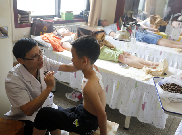 图为该院中医传统疗法科室主任王洪刚(左一)嘱咐贴敷的小朋友注意事项。 李春辉/摄