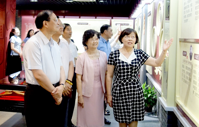 王国强(左一)等在南通中医药文化博物馆听取历代南通籍中医药名家介绍。