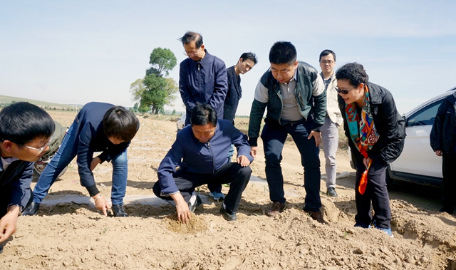 徐治(前排右二)在察看种植黄芪生长的土壤情况