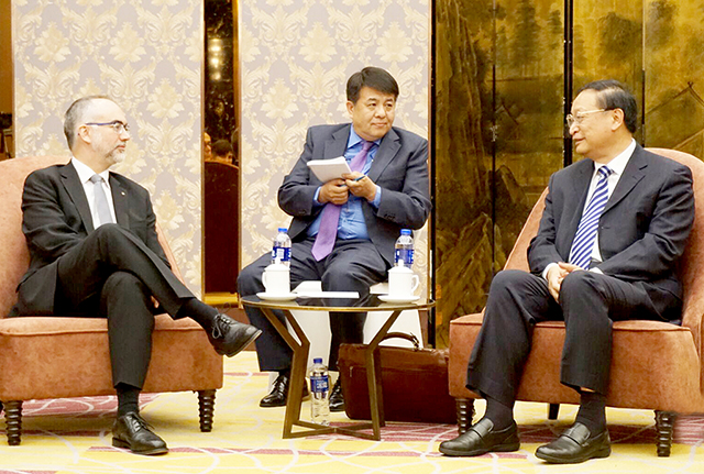 王国强(右一)会见西班牙加泰罗尼亚自治区知识商务部秘书长瓜蒂耶拉(左一) 。 本报记者 赵维婷摄