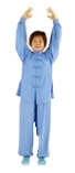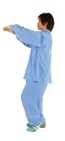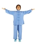提示:(1)两臂由体两侧上举时,要和身体保持在一个平面上。以便做到扩胸、打开膻中穴,并刺激夹脊区形成膻中、夹脊前后呼应之势;(2)两手下落时要松肩、垂肘、松腕,两臂走弧线由体前徐徐下落,脊柱微做前后曲动;(3)定式后,脊柱要中正,不偏不倚,并呈上下牵拉状。松肩、虚腋、含胸、拔背、收腹、敛臀。