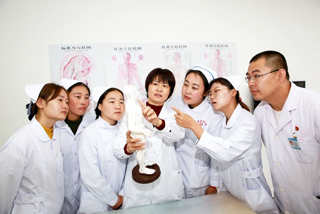 图为驻点帮扶医疗队队长杨怡坤(中)日前在对五寨中医院医护人员进行中医适宜技术培训。