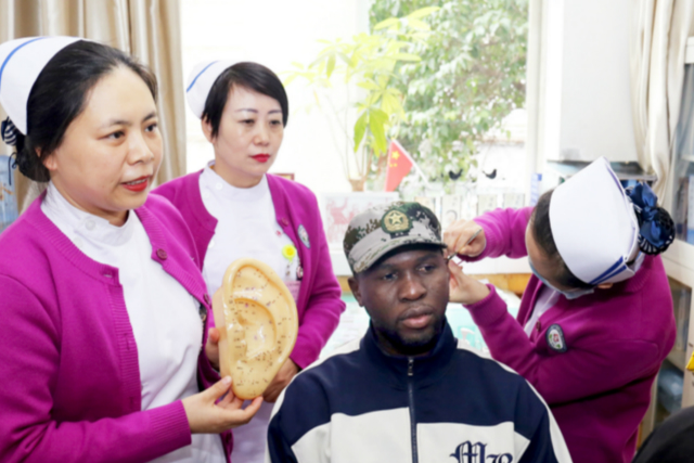 近日,来自非洲冈比亚共和国的25名外国友人到陕西中医药大学第二附属医院参观,学习中医适宜技术,近距离感受中医药文化。图为外国友人体验中医耳穴疗法。