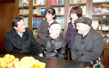 仝小林(左一)聆听两位恩师周仲瑛(右前二)与李济仁(右一)的教诲。