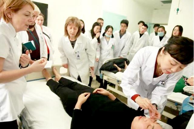 日前,来自英国针灸协会的10名针灸医师前往黑龙江中医药大学附属第一医院针灸五科,参观学习电针、项针、头针丛刺、腹针、温针灸、拔罐、刮痧、艾灸、耳穴、穴位注射等针刺技术。