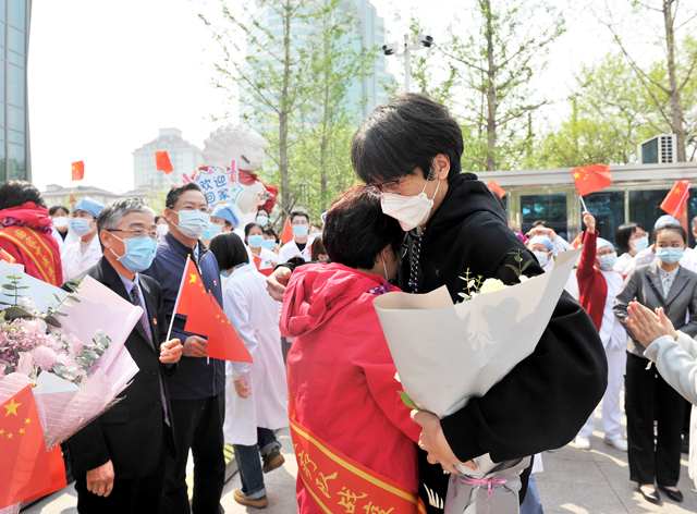 上午10时,载着广安门医院队员的大巴车停在广安门医院新门诊楼前,前来迎接的医护人员列队两侧,手拉横幅,挥舞国旗,“欢迎回家”“辛苦啦”的呼喊声在迎接的人群此起彼伏,不少就诊患者也为医疗队员鼓掌喝彩。