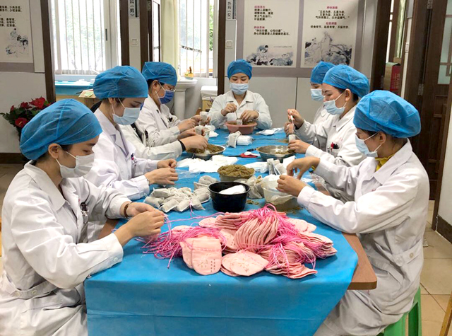 图为该院医护人员正在配制中药防疫香囊。 卢秀宁/摄