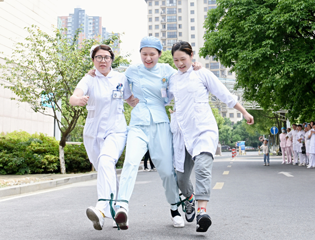 江苏省宜兴市中医医院举行“爱在五月·放飞心情”系列庆祝活动,组织护理人员开展趣味竞走比赛等,为工作辛苦、忙碌的白衣天使们减压。 潘静/摄