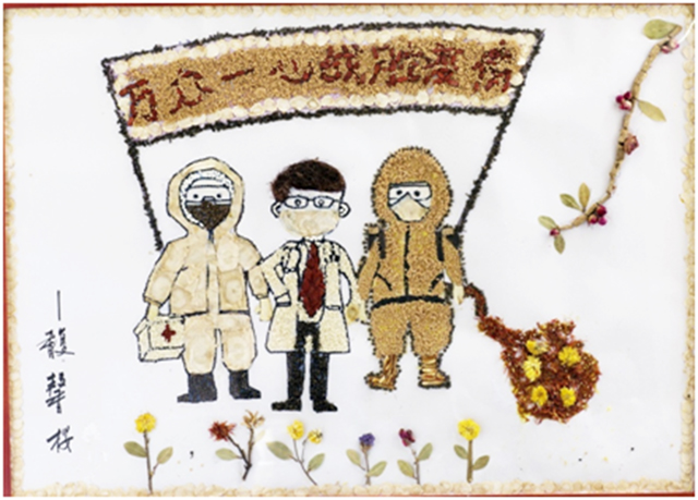 南方医科大学中西医结合医院护理部举办了一场别开生面的“本草印画”展。“本草印画”分为抗疫篇、文化篇、院景篇等共28件作品。图为作品“万众一心战胜疫病”,用红花、吴茱萸、玫瑰等中药材绘制,表达了万众一心战胜疫情的决心和信心。南方医科大学中西医结合医院护理部供图