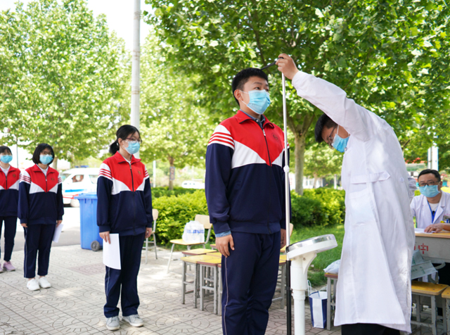 图为5月13日,该院医护人员在内丘中学给学生进行体格检查。