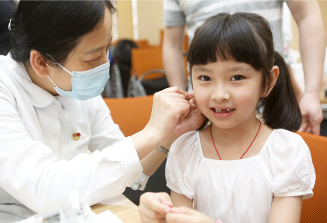 浙江省中医院医护人员为孩子进行耳穴压豆