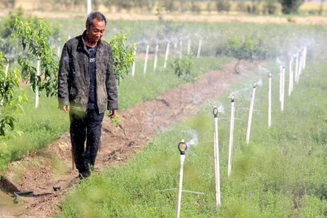近年来,河北省石家庄市行唐县把发展中药材种植作为当地农业产业结构调整和产业扶贫的主推产业。截至目前,行唐县中药材种植近5万亩,覆盖全县15个乡镇和1个经济开发区、年产值近2亿元,有力促进农民增收和县域经济发展。图为行唐县只里乡东秀村天然中药材合作社的农户在查看黄芩的喷灌作业。