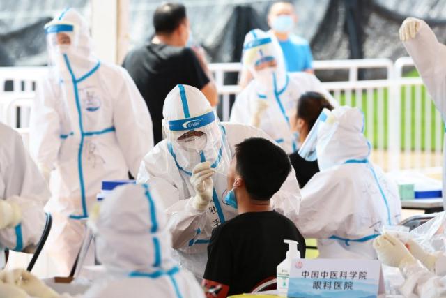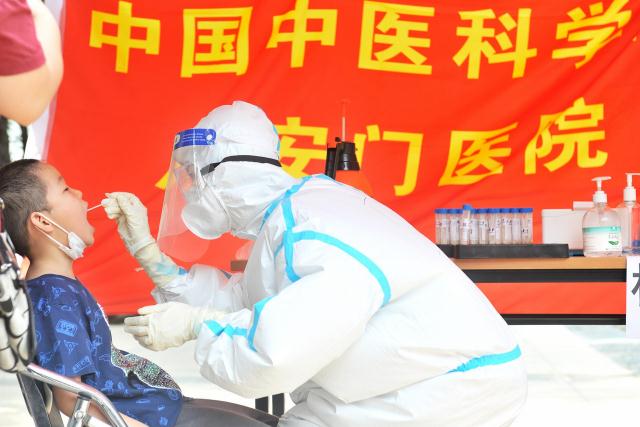 为做好重点人员病毒核酸检测排查,及时有效缓解社区防疫压力,6月20日,中国中医科学院广安门医院选派61名一线医护人员组成核酸采集工作组,参与承担西城区部分社区居民新冠肺炎核酸筛查。图为广安门医院医务人员在北京市西城区西提红山会所广场站点,为附近居民开展核酸检测采集工作。 高学成/摄