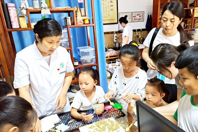 陕西省渭南市蒲城县中医医院治未病科在端午节期间,举办制香囊、识中药的实践活动,让孩子们有机会走近中医药文化,了解中医药知识。图为该院治未病科的医务人员向孩子们讲解中医药知识。