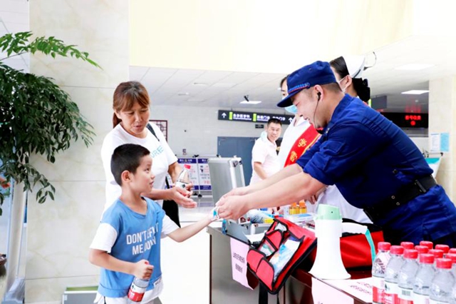 8月5日,安徽省颍上县中医院联合山东临沂市消防救援支队抗洪突击队开展便民服务活动,医护人员和消防官兵为群众宣讲疫情防控、疾病预防、消防安全知识,并发放矿泉水、口罩、防暑降温常备药品等。 黄剑/摄