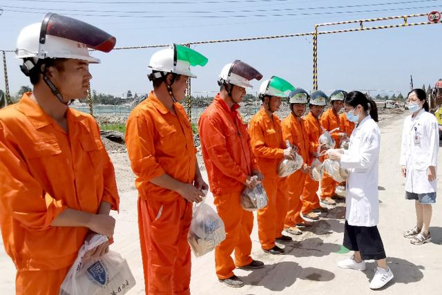 图为该院医护人员为工人赠送中药凉茶。 本报记者 应晓燕/摄