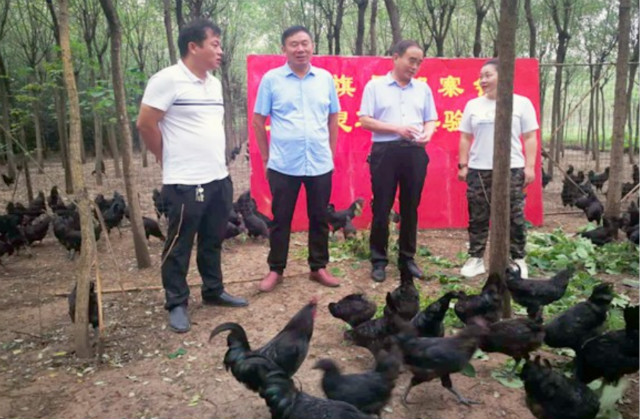 △中国中药协会专家梁士坤(左二)与郝寨镇镇长朱义斌(右二)在五黑灵芝鸡实验中心查看五黑灵芝鸡生长情况。