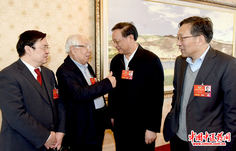 3月8日,97岁的全国政协委员、国医大师李辅仁(左二)和国家卫生计生委副主任、国家中医药管理局局长王国强委员(右二)、史大卓委员(右一)、温建民委员(左一)在医卫界联组会后亲切交谈。李辅仁称赞近年来中医药事业的快速发展。 中国中医药报记者 巨锋/摄