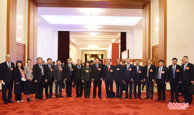 3月12日上午,十三届全国人大二次会议召开第三次全体会议。医卫界部分代表委员齐聚人民大会堂,畅谈中医药事业传承创新发展。图为代表委员在人民大会堂合影留念。左起:唐旭东、卢传坚、李延萍、吴焕淦、胡刚、熊维政、黄璐琦、张伯礼、陈香美、于文明、耿福能、唐农、方剑乔、吴浩、戴铭、于圣臣、吴相君、姜明。