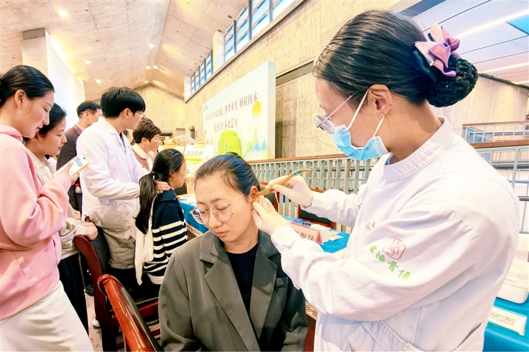 杭州市富阳中医骨伤医院医务人员为市民游客开展耳穴压豆免费中医理疗服务