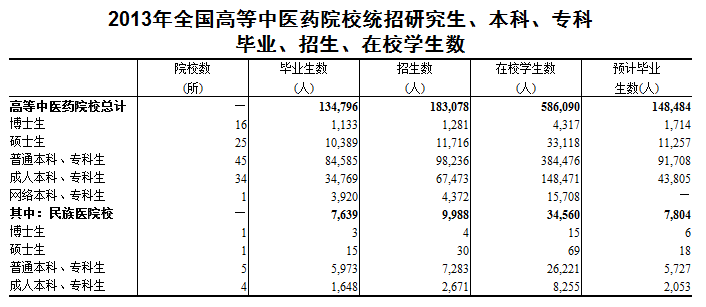 2013年全国高等中医药院校统招研究生、本科、专科 毕业、招生、在校学生数