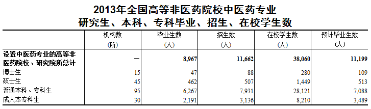 2013年全国高等非医药院校中医药专业 研究生、本科、专科毕业、招生、在校学生数