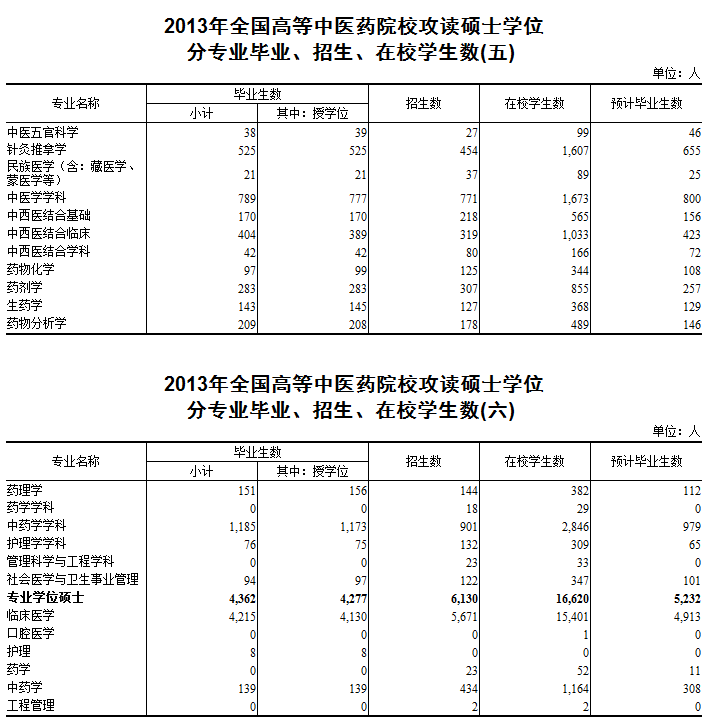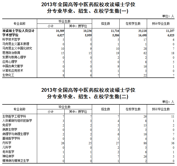 2013年全国高等中医药院校攻读硕士学位 分专业毕业、招生、在校学生数