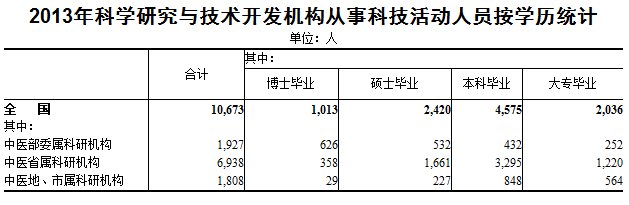 2013年科学研究与技术开发机构从事科技活动人员按学历统计