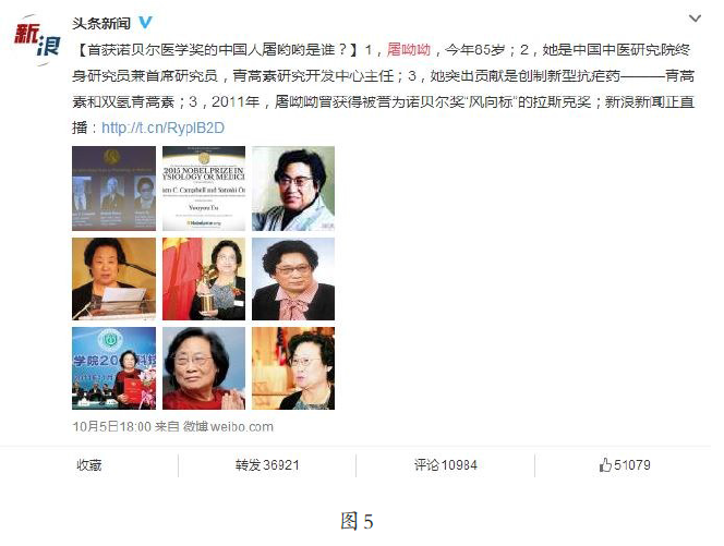 头条新闻在屠呦呦获奖消息传来的第一时间发布了微博,该微博目前得到3万多次转发,超过1万的评论和5万的点赞(如图5):