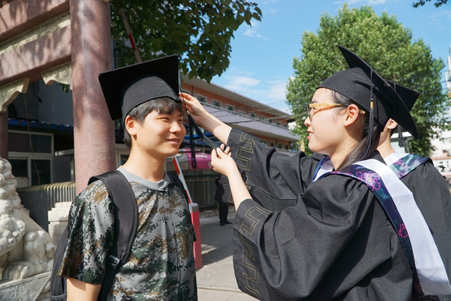 一起拍毕业照的同学为毛号兵(左一)整理学士帽。 本报记者 周蔓仪/摄