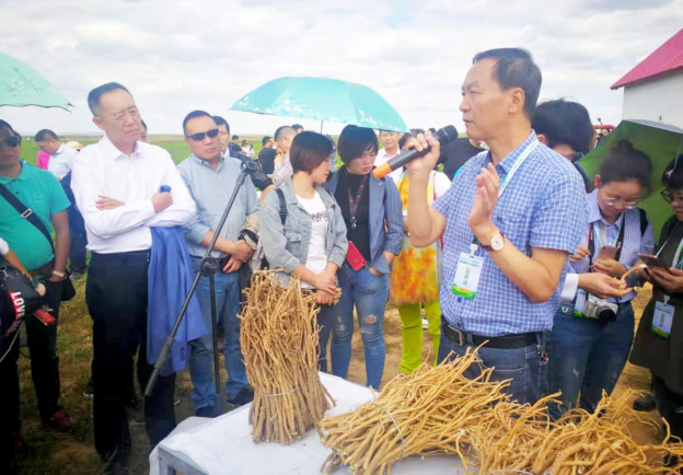 △固阳县中药材专家在蒙古黄芪(有机)示范基地讲解有机黄芪鉴别。