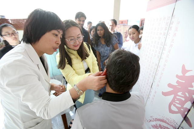 11月1日,浙江省中医院举办中医药嘉年华暨膏方节活动,活动现场吸引了许多正在该院学习、参观的欧美及东南亚的外国学者和学生,他们亲身体验了中医药特色疗法,品尝了药膳美食。图为外国学生体验耳穴疗法。