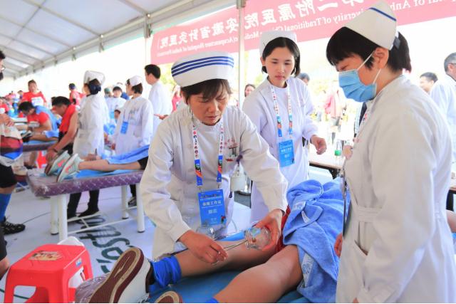 近日,2019合肥国际马拉松鸣枪开赛。在赛后恢复区,来自安徽中医药大学第二附属医院(安徽省针灸医院)的医疗团队,为参赛选手提供推拿、针灸、拔罐等中医特色医疗服务。医院还组织志愿者指导参赛者用“八段锦”进行拉伸恢复,为大赛注入了更多中医元素。图为医护人员在为选手拔罐。 王津淼摄
