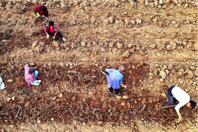 近日,安徽省亳州市各地农民抢抓农时,做好中药材采收、播种等工作,田间地头一派繁忙景象。图为安徽省亳州市谯城区十八里镇孙口村的农民在田间采收中药材白芍。刘勤利摄