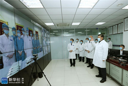习近平十分牵挂湖北和武汉的疫情。在地坛医院远程诊疗中心,习近平通过视频连线武汉市收治新冠肺炎患者的金银潭医院、协和医院、火神山医院,向疫情防控一线的医务工作者、干部职工和人民解放军指战员了解情况、听取意见和建议。他强调,全国广大医务工作者不忘初心、牢记使命,响应党的号召,义无反顾冲上疫情防控第一线,同时间赛跑,与病魔较量,顽强拼搏、日夜奋战,展现了对党、对人民高度负责的精神面貌。他指出,现在疫情防控正处于胶着对垒状态,广大医务工作者一定要坚持下去,发扬特别能吃苦、特别能战斗的精神,发挥火线上的中流砥柱作用,始终把人民群众生命安全和身体健康放在首位,全力以赴救治患者,打好武汉保卫战、湖北保卫战。