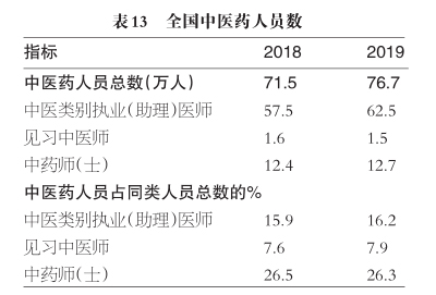2019年末,全国中医药卫生人员总数达76.7万人,比上年增加5.2万人(增长7.2%)。其中:中医类别执业(助理)医师62.5万人,中药师(士)12.7万人。两类人员较上年均有所增加(见表13)。