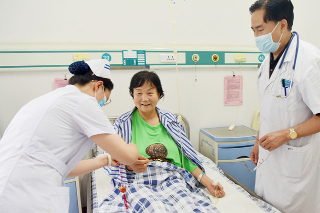 6月24日,山西省长治市中医研究所附属医院为患者赠送中药香囊,佩戴五色绳。 通讯员 杨燕/摄