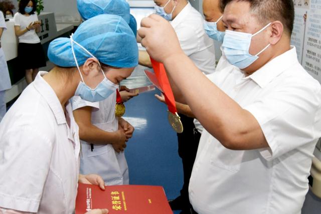 图为该院院长何绍斌为一线医务人员颁发奖章。 本报记者 胡 梦 通讯员万凌翔 傅坚摄影报道