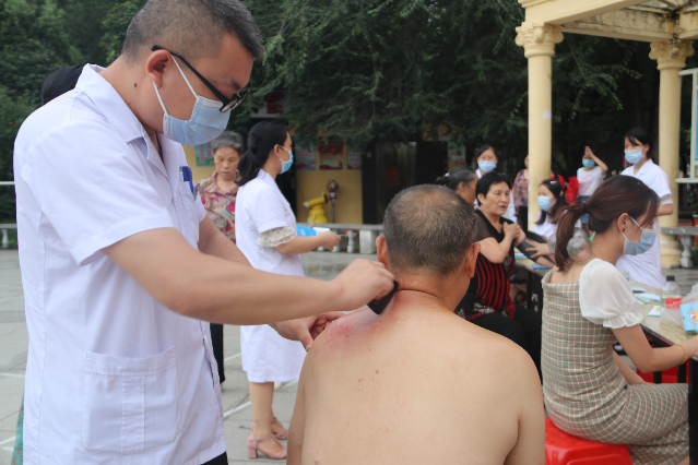 近日,湖北省十堰市中医医院东风分院组织医务人员利用下班时间走进社区,为社区群众开展穴位贴敷、拔罐、艾灸等中医特色服务,得到社区居民好评。图为该院医务人员为社区居民刮痧。 王权/摄