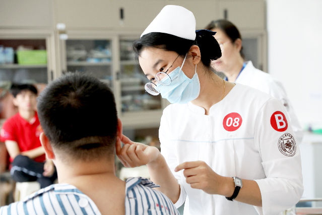 图为参赛人员正在进行耳穴压豆操作。 本报记者 于伟/摄