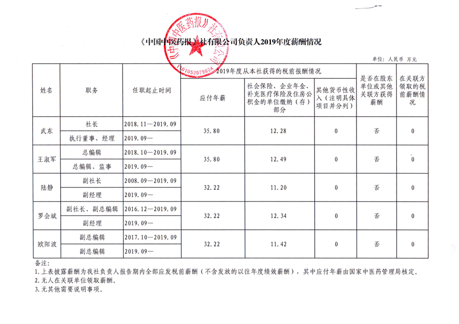 《中国中医药报》社有限公司负责人2019年度薪酬情况