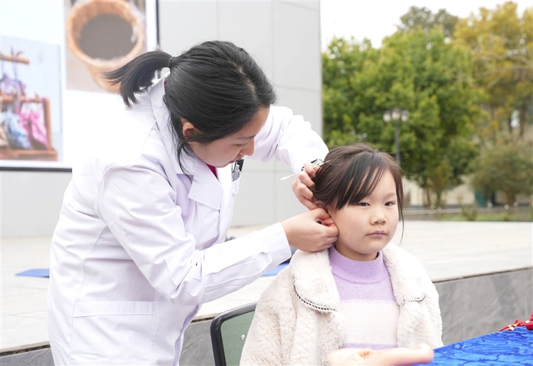 四川省梓潼县中医院医护人员为学生进行耳穴压豆