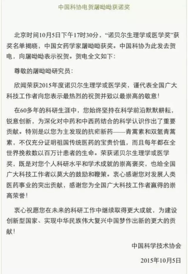 屠呦呦获得2015年诺贝尔生理学或医学奖
